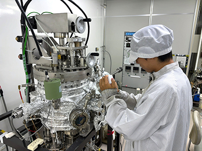 私の研究は、半導体や自動車において多く使用されている薄い金属膜である「薄膜」を作製して、材料特性を評価しています。具体的には、薄膜の作製方法を変え、薄膜内の不純物を減らすことで特性向上できないかという研究です。