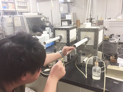私は佐賀大学大学院工学系研究科・先端融合工学専攻の修士1年生です。先端融合工学専攻は電気、機械、化学系分野が融合しており、各分野の視点から研究課題や解決法を考えることができます。私は化学分野を専攻しており、現在セラミックス分野の研究室で焼物の表面を覆うガラス(釉)の研究を行っています。特に、釉中で結晶を成長させ模様とし、これを制御することを研究しています。具体的には、釉薬の組成や配合割合、焼成温度を変えて結晶の形や大きさを制御することを目的としています。釉薬の模様を制御できるならば美しい陶芸作品をつくることができると考え、ワクワクしながら実験してます。