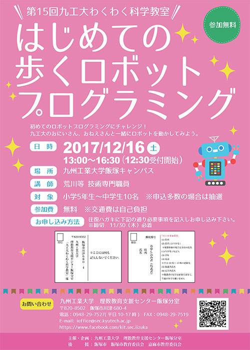 第15回九工大わくわく科学教室「はじめての歩くロボットプログラミング」を下記の通り開催します。