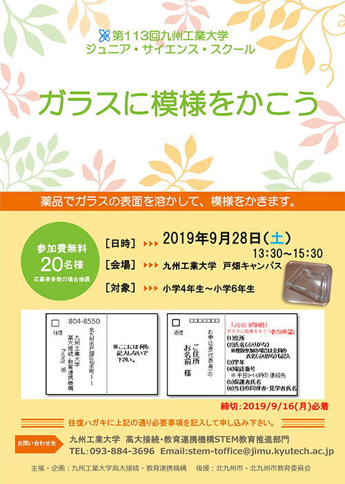 第113回ジュニア・サイエンス・スクール「ガラスに模様をかこう」を、下記の通り開催します。薬品でガラスの表面を溶かして、模様をかきます。自分だけのオリジナルグラスを作ってみませんか??