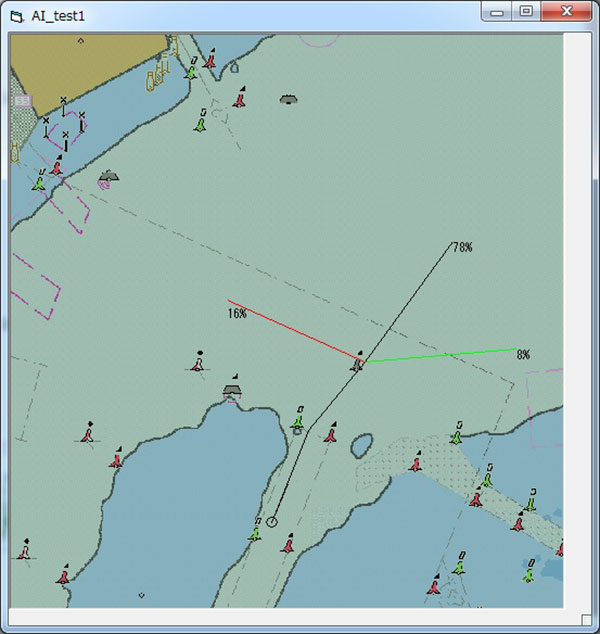 周りの船舶との衝突を避けて安全な航海を支援するシステムには、周りの船舶の動きを予測して、的確な避け方を示すことが要求されます。この要求を的確に処理する手法の1つとして、近年広く利用されているAIがあります。AIで湾内を航行する船舶の動きを予測するためには、湾内で船舶がどうように動くのかをAIに学習させる必要があります。東京海洋大学海洋工学部の先端ナビゲートシステム(図1)には、過去5年間の東京湾を航行する船舶の動きのデータが蓄積されています。そこで研究室では、AIに東京湾を航行する船舶の動きのデータを学習させ、そのAIを使って航路を航行している船舶が航路を出た後、どちらの方向に進むかを予測させる研究を行っています。図2は、このAIにより航路出口でどちらの方向に進むかを予測させた計算例です。残念ながらまだ100%の確率で予測ができていないので、さらに研究開発を進めて、高い確率で船舶の動きを予測し、周りの船舶との衝突を的確に避ける方法を示すシステムを開発していく予定です。