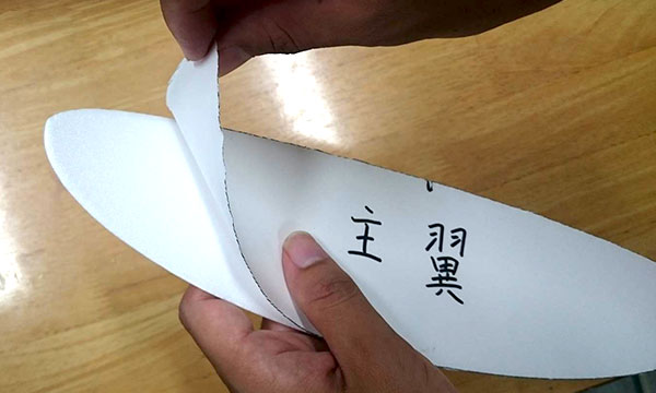 翼に絵を描いて、裏に両面テープをはる(さっきの切り込みを結ぶように)