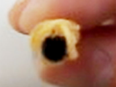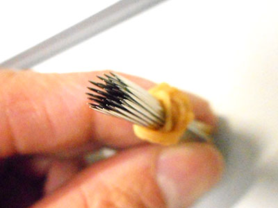 さて、出来た針の束を、尖った側の真正面から見てみるとどう見えるでしょう。ピカピカな針のはずなのに、かなり黒っぽく(真っ黒に)見えるのでは?何故でしょうね。