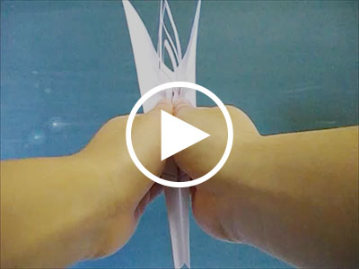 誕生日カードのように開くと、しかけられたギミックによって動きが生じるカード(ポップアップカード)には色々なバリエーションがあります。ここでは、上図のポップアップスピナーと呼ばれるカードを作ってみましょう。これは、水平方向に回転の軸をもち、上下にとがった羽が回転するという動きをします。このポップアップスピナーという名前をつけたのは西原明さんです。1970年代にはもうあったらしいのですが、最初に誰が考案したのかということは、はっきりとはしていないようです。