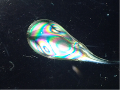 偏光板を使って『オランダの涙』の内部がどのようになっているのか観察します。外側と内側で光の屈折の仕方が異なっていることが観察できます。