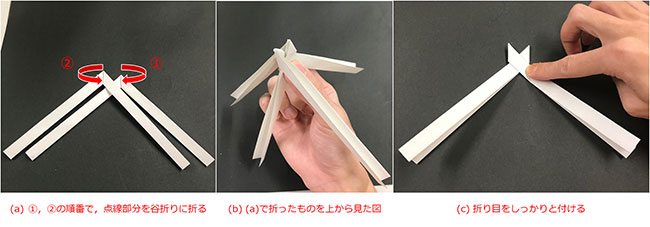図3 (a)、 (b)のように切り出した2枚の紙それぞれに、幅2.5 cmの真ん中のところで縦方向に折りすじを付け、長さ29.7cmの真ん中のところで横方向に折りすじをつけます。さらに、図3 (c)、 (d)のように斜めの折りすじを付けます。