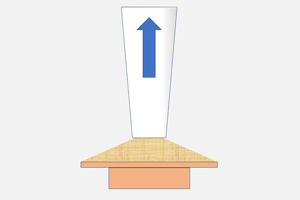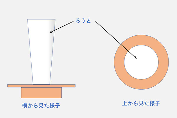段ボールが折り曲がらない様に気を付けながら、円形に切ります。これが天板になります。天板の大きさは任意の大きさです。次に、天板と柱を作ります。下の図では組み立てた段ボール箱に穴を空け、そこに柱突き刺して天板と底板を接着していますが、底板は天板より大きく、柱は天板の直径より小さく、用意した砂で埋まらない程度の高さであれば、形はどのようなものでも構いません。また、この試験台は、天板と底板との隙間を確保するため(こぼれ落ちた砂で砂山の端が分からなくなることを防ぐため)に設けたものなので、天板をしっかりと支えられて隙間を確保できればどのようなものでも構いません。この時、天板が水平になるように注意します。