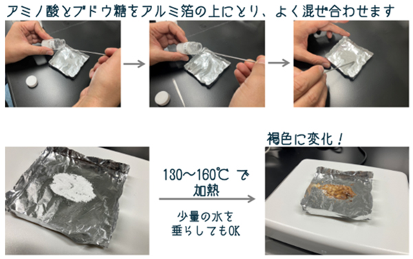 文章ではにおいを伝えることができませんので、実際にどのような香りがするかは実験してみてのお楽しみです。今回、アミノ酸と糖の反応を「におい」を通して感じることができました。アミノ酸と糖だけの単純な実験ですが、中で起こっている化学反応は極めて複雑で、どのようなものができているのか、明らかになっていない部分も残っています。ちなみに、糖だけでおこる反応はカラメル化反応と言って、メイラード反応とは区別されます。