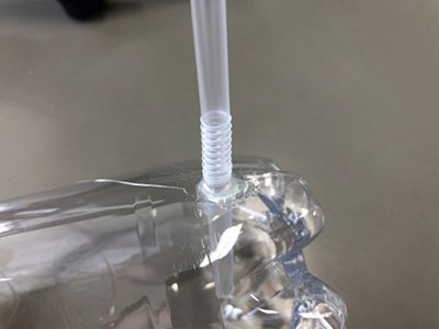 グルーガンでストローを固定します。短く切断したほうをL字型クリップと合わせてキャップに固定します。切断しなかったほうは曲がり部から短いほうをペットボトルに差し込んで固定します。水や空気が漏れないよう、しっかりと固定材をつけましょう。水を入れると漏れが分かります。