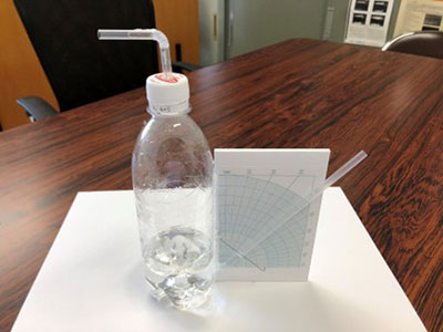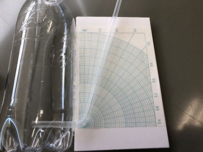 スチレンボードを適当な大きさに切断し、ストローに沿うようにしてペットボトルに固定しましょう。固定はグルーガンで行います。方眼紙をスチレンボードに貼りつけます。円グラフの中心がストローの曲がり部に一致するようにするのがベストです。