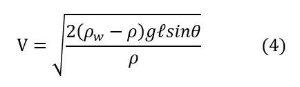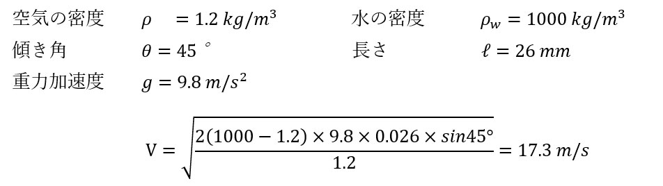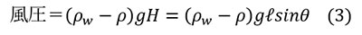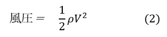 式(2)と(3)の風圧は等しいので、式(4)にある速度Vの計算式が導かれます。