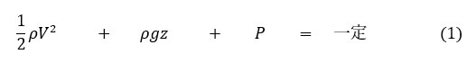 ベルヌーイの定理は式(1)に示す速度エネルギー 、位置エネルギー、圧力エネルギーの和が一定になることを示したエネルギー保存則と呼ばれます。