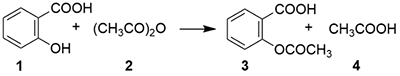 解熱・鎮痛薬になるアセチルサリチル酸(3)は、サリチル酸(1)をアセチル化して得られます。サリチル酸(1)は柳の樹皮に含まれる薬効成分として知られていましたが、その副作用がこの反応で抑えられます。アセチルサリチル酸が生成することを、呈色反応・融点・赤外吸収で確かめてみましょう。