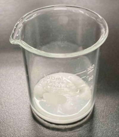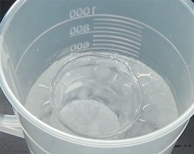 サリチル酸(1)3.0g、無水酢酸(2)3.0gを100mLビーカーに入れてよく混ぜます。通常は酸触媒を使用しますが、ここでは使用しないで行います。