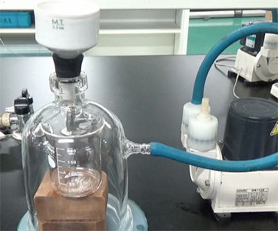 冷却後水の入ったビーカーにあけてよく砕き、これを吸引ろ過で分け取ります。固形物がアセチルサリチル酸です。