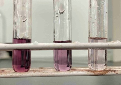 ろ過をしながら固形物を水で洗浄します。これにより残っていたサリチル酸がろ液に移動します。ろ液に塩化鉄(Ⅲ)水溶液を加えると写真のように青紫色あるいは赤紫色に呈色します。これはサリチル酸のようにベンゼン環に直接結合したヒドロキシ基をもつ化合物に特有の呈色反応です。また、洗浄するたびにろ液のサリチル酸が少なくなっていく様子がわかります。