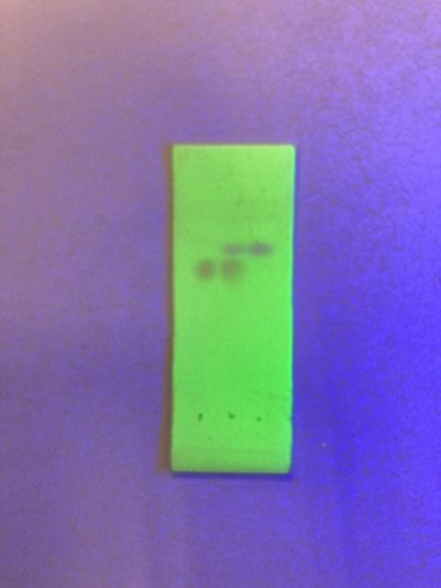 シリカゲルを塗布したプラスチックプレートの下部につけた点に、アセチルサリチル酸(左)、サリチル酸(右)、両者の混合物(中央)の溶液を吸着させます。プレートの下端をヘキサン、酢酸エチル、酢酸混合溶媒に浸けると有機溶媒がシリカゲル表面を上端に向かって移動していきます。このときアセチルサリチル酸とサリチル酸も移動しますが、シリカゲルとの相互作用の違いにより移動距離にも差が生じます。これによって混合物を分離してアセチルサリチル酸を確認することができます。このような分析手法は薄層クロマトグラフィーと呼ばれます。