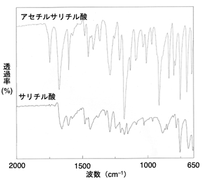下図はアセチルサリチル酸とサリチル酸の赤外吸収スペクトルの一部です。両者は類似しており、カルボキシ基など共通する吸収帯が現れますが、アセチルサリチル酸特有の吸収帯も確認されます。横軸は波数(波長の逆数)、縦軸は赤外線の透過率です。下向きのピークは赤外線の吸収を表しています。