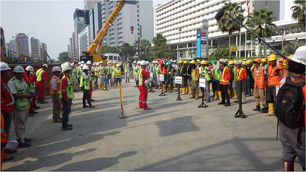 図-4 ジャカルタ(インドネシア)の地下鉄⼯事で OSV 技術を利用した安全管理方法を作業員に説明 (このプロジェクトは 2015 年 11 月 30 日の NHK 番組「プロフェッショナル- 仕事の流儀-」で放映)