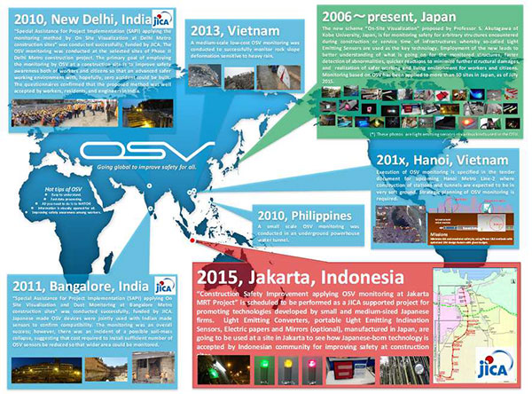 OSV に関する研究開発は、2006 年度に「光を使って安全・危険情報をリアルタイムに原位置に視覚的に表示する」研究として始まり、2010 年 1 月に⺠間会社 18 社が参加する OSV 研究会が設立されました。その後、センサメーカー、測量、自動車制御、建設、コンサルタント、ベンチャー企業、国内外の複数の⼤学、研究機関などの多彩なバックグラウンドを有する 80 以上のメンバー会員からなる研究会となり、神⼾⼤学が中心となって活発な産学連携活動を展開しています。この OSV 産学連携プロジェクトは学生の研究指導から企業との共同研究、研究成果の社会実装(日本国内 100 箇所以上、海外ではフィリピン、インド、インドネシア、ベトナム、シンガポール、ラオスで適用例あり)までを総合的に包含する流れを現実化しており、光る計測装置の開発・改良と社会実装を通じて、人間環境の安全・安心化における新しい概念"On-Site Visualization"を国内的、および国際的に普及させるための活動を展開しています。