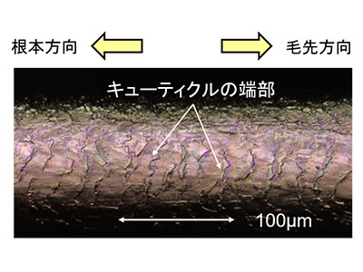 最後にナノ触覚センサで見ることができる質感の世界を1つ紹介します。図3は髪の毛の光学顕微鏡写真です。私たちの指先で髪の毛を「毛先方向」と「根本方向」になぞっても「毛先になぞる方が滑らか?」と感じる程度です。一方、ナノ触覚センサでは「毛先方向」と「根本方向」の違いが非常に明確に分かります(図4)。厚さ0.2ミクロン前後の薄いキューティクルを正確に数えられるとともに、根元に向かう場合はキューティクルの捲れが摩擦を強くする様子まで判ってしまいます。ナノ触覚センサは指先以上に正確な「手触り」を感じ取る新しい技術です。各種製品や素材が持つ触感や皮膚の健康状態を数値化したり、触覚を持つ先進医療機器の開発に応用されたりするなど、多くの分野で応用研究が進められています。