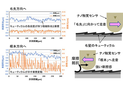 図4 ナノ触覚センサによる髪の毛表面の計測例(なぞる方向の違いを比較)